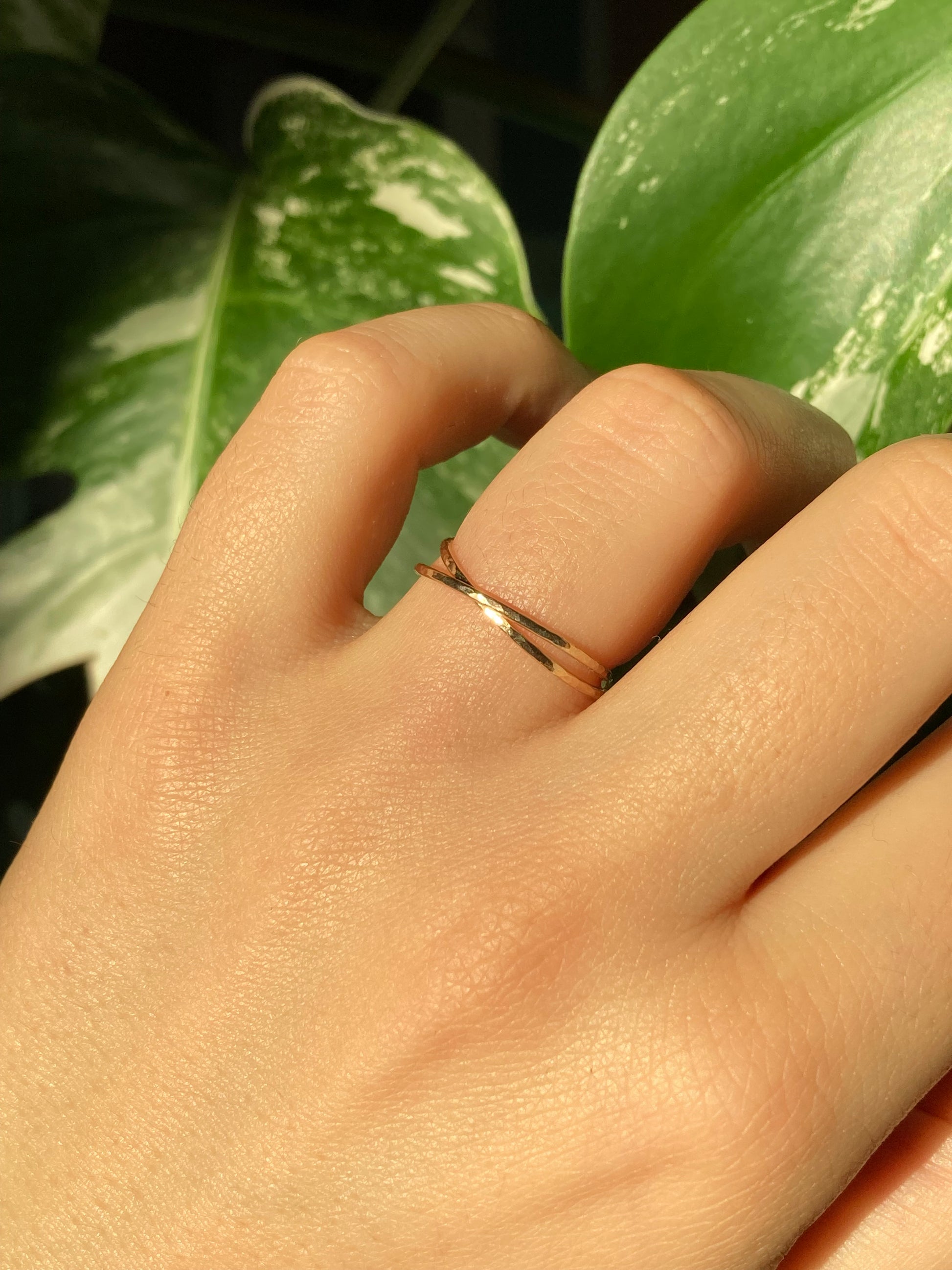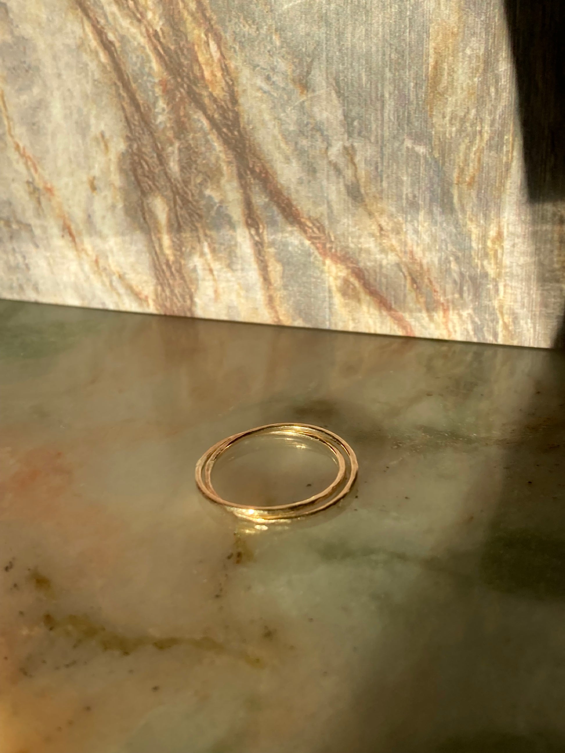 Each 1 mm band is meticulously textured by hand, reflecting light beautifully to create a warm golden glow. The subtle hammered finish adds artisanal charm while ensuring a comfortable, lightweight fit for everyday wear. Whether worn alone as a sophisticated statement or stacked with other rings, this piece exudes effortless style and mindfulness.