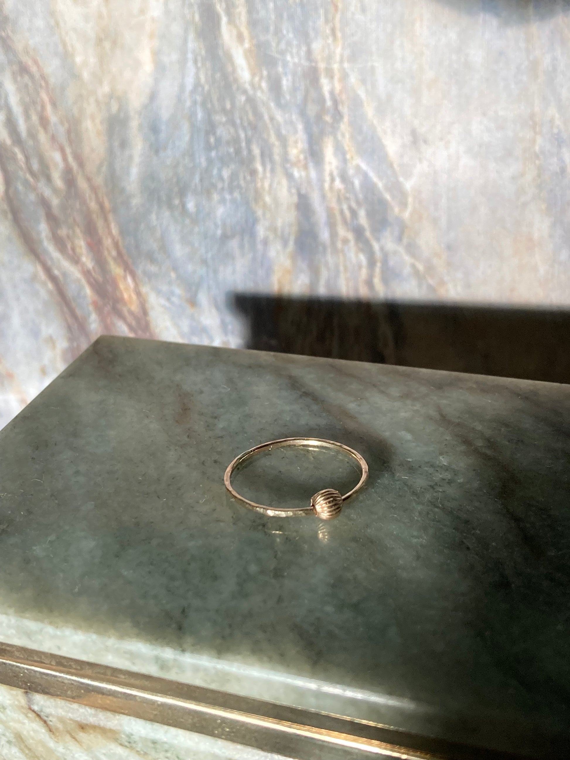 This elegant 9K solid gold fidget ring is meticulously handcrafted in my Berlin studio, blending timeless beauty with calming functionality. Designed for those who appreciate both aesthetics and mindfulness, this artisan ring features a delicately hammered gold band and a smooth, rolling 9K gold bead that moves freely for a soothing tactile experience. Whether used as an anti-anxiety aid or a stylish everyday accessory, this ring offers both relaxation and refined elegance.