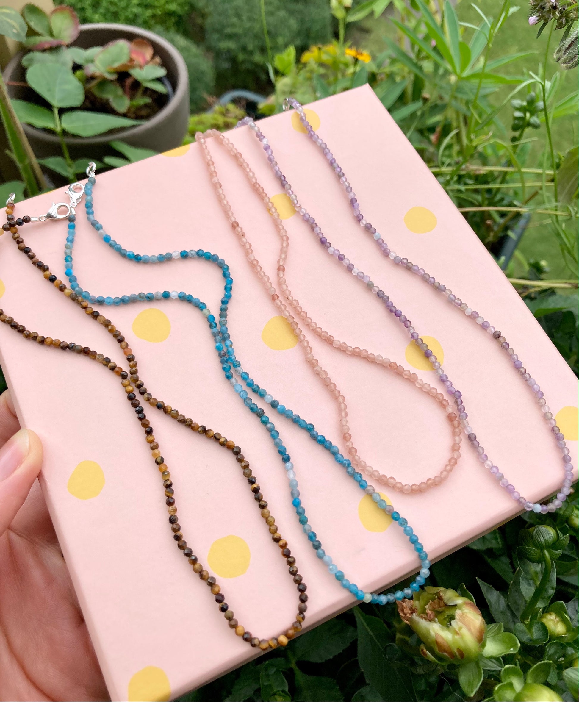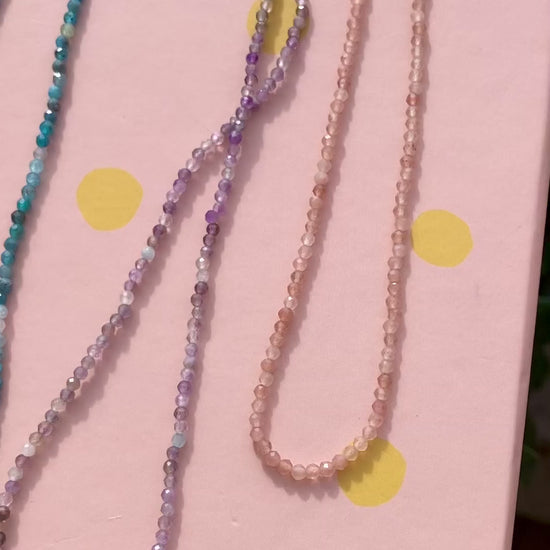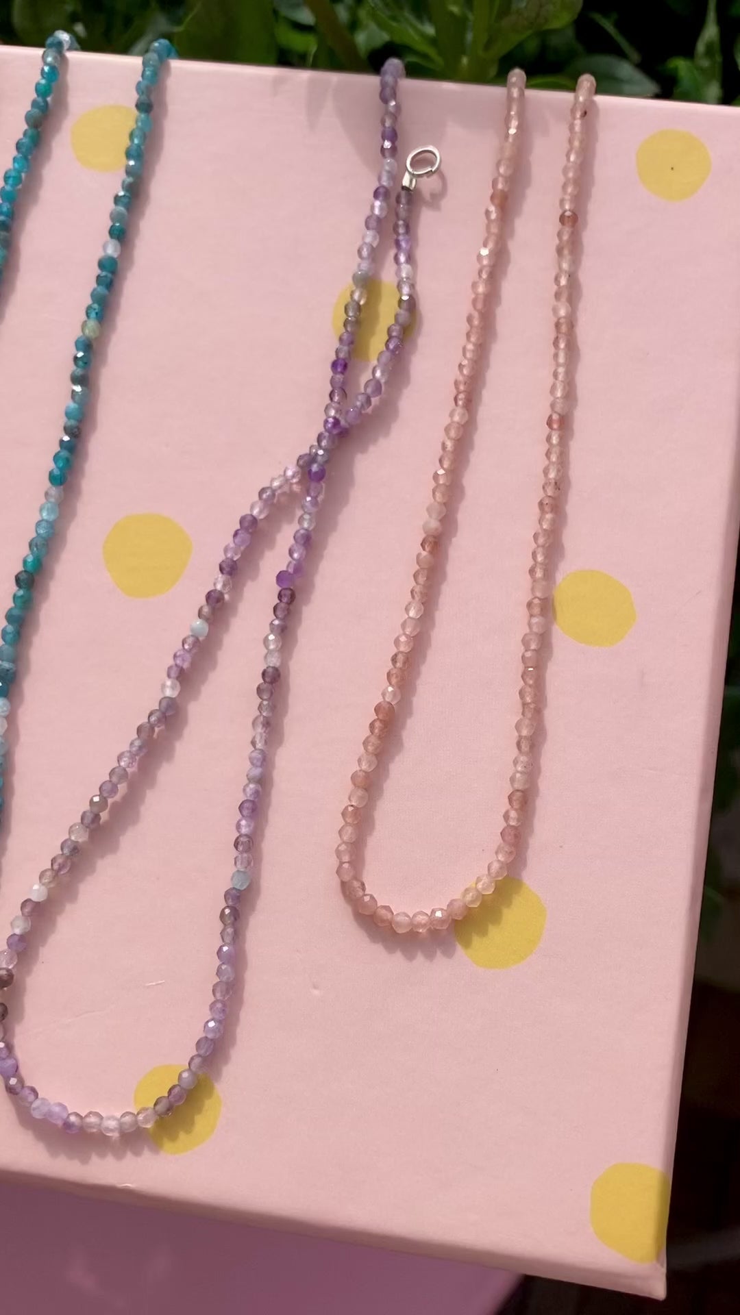 Elevate your style with this ultra-delicate elastic necklace, featuring tiny 1.5-2mm faceted gemstones: pinkish-yellow Sunstone, uniquely beautiful Tiger Eye, sea-blue Apatite, deliciously pink Tourmaline, and rich Purple Amethyst. The closure is crafted from 925 silver, adding a touch of elegance.