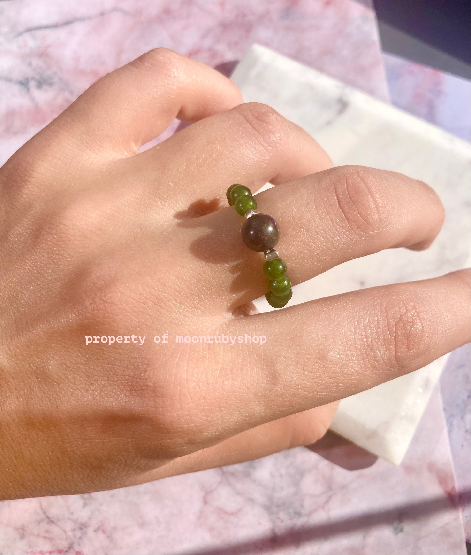 - Premium Materials: The ring features deep green 4mm Taiwanese Jade beads paired with a rare 6mm Black Opal bead, showcasing vibrant "fireworks" of color. Each bead is smooth, top quality, and naturally beautiful.
